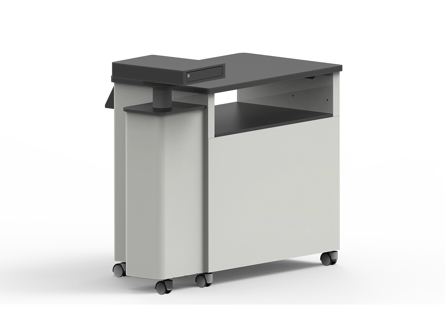 The heated surface, open shelf, and movable mechanism are made from antibacterial Corian material.